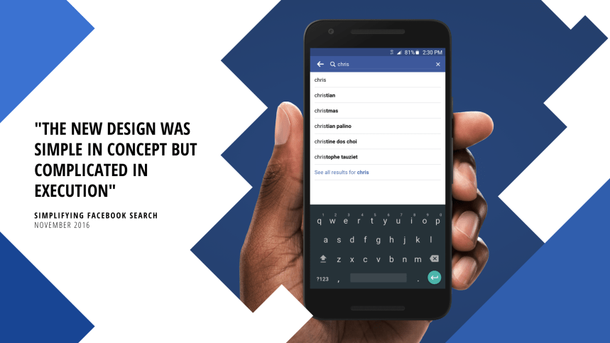 This still remains one of my favorite all-time product initiatives. With over two billion searches a day, redesigning the search experience was a massive undertaking. The search box persists at the top of the Facebook app and serves as an entry-point to every surface and piece of content on the platform. Meanwhile, we had to support competing goals for navigation, discovery, personalization, and speed.