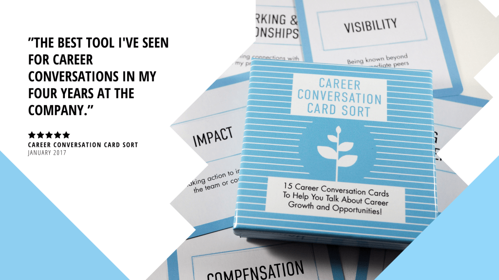 Inspired by the prioritization powers of qualitative research methods, I developed the Career Conversation Card Sort in 2017 as a manager’s tool for unpacking ambiguous career-related concepts and growth goals with direct reports. The tool includes a discussion guide and cards with concepts like Promotion, Role Change, Work-Life Balance, and Impact.